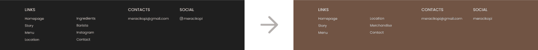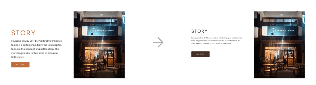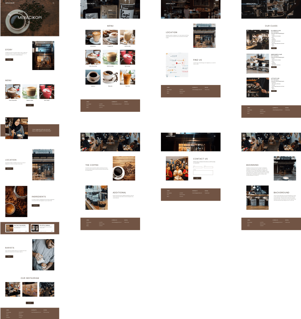 From the first design homepage, I got some revisions. The first revision is changing the CTA button color to ‘dark brown’ to represent the coffee bean's color. Then I also reduced the size of the typography to give a more minimalist and simple look. For the title text, I also changed the color to ‘dark brown’ to give a similar look on each page from the text to the button. The second revision is changing the footer color from black to dark brown, so that the button, text, and footer color, will give the same look and represent Meracikopi’s brand better.