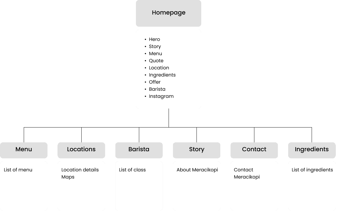 After the wireframe was approved, I converted it into a high-fidelity design by giving color, typography, image content, etc. In this phase, I try to represent Meracikopi’s brand and also keep the design simple, minimalist, and clean. And this is the initial design of the Homepage.